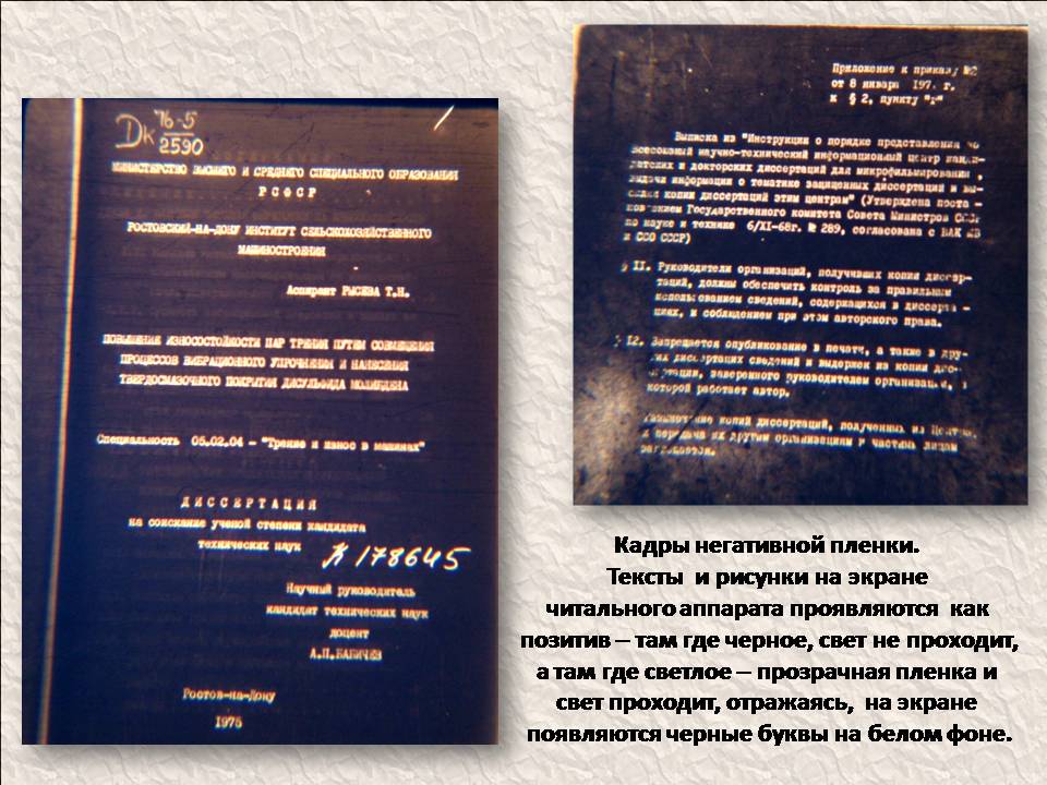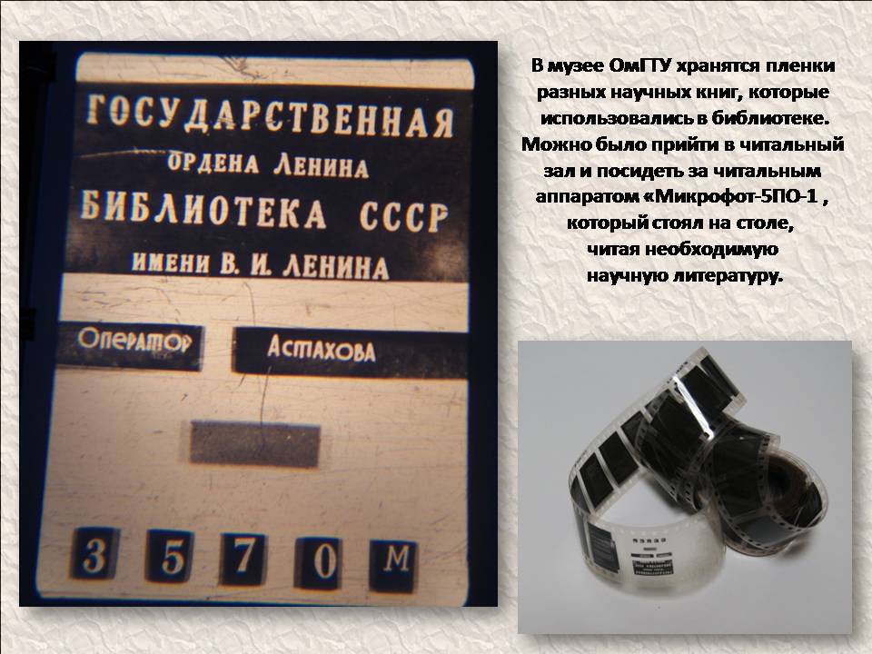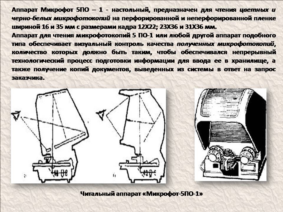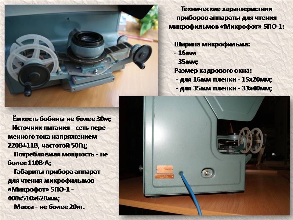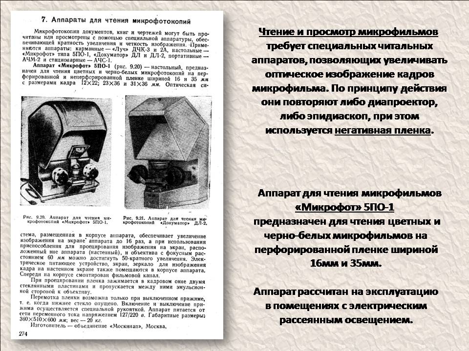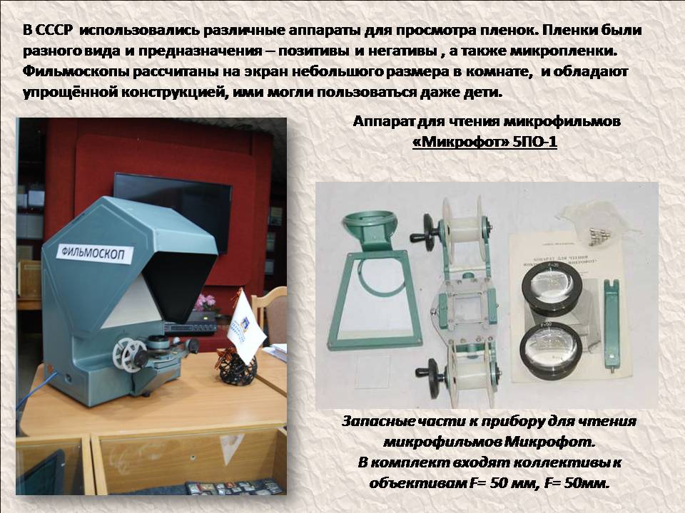 Чтение и просмотр микрофильмов требует специальных читальных аппаратов, позволяющих увеличивать оптическое изображение кадров микрофильма.Такой аппарат есть в музее университета - Микрофот» 5ПО-1