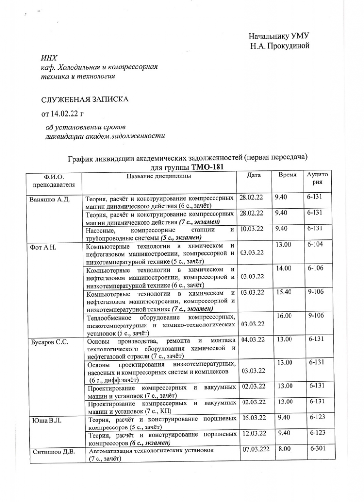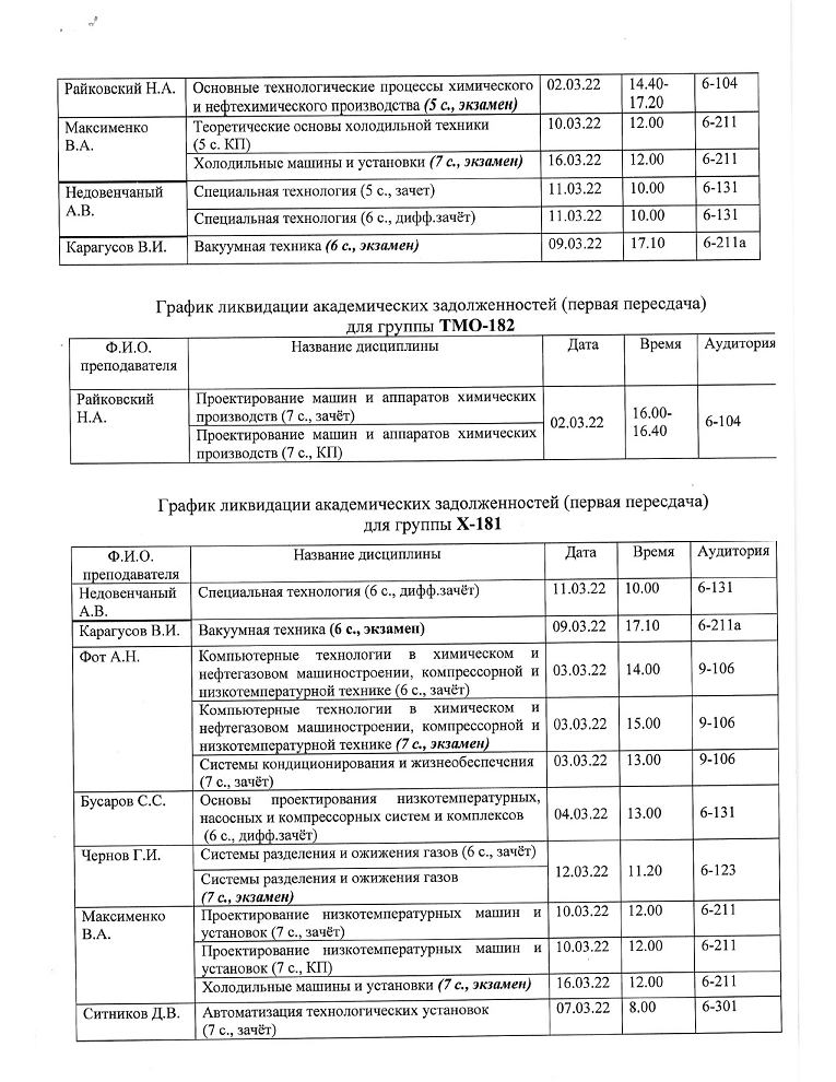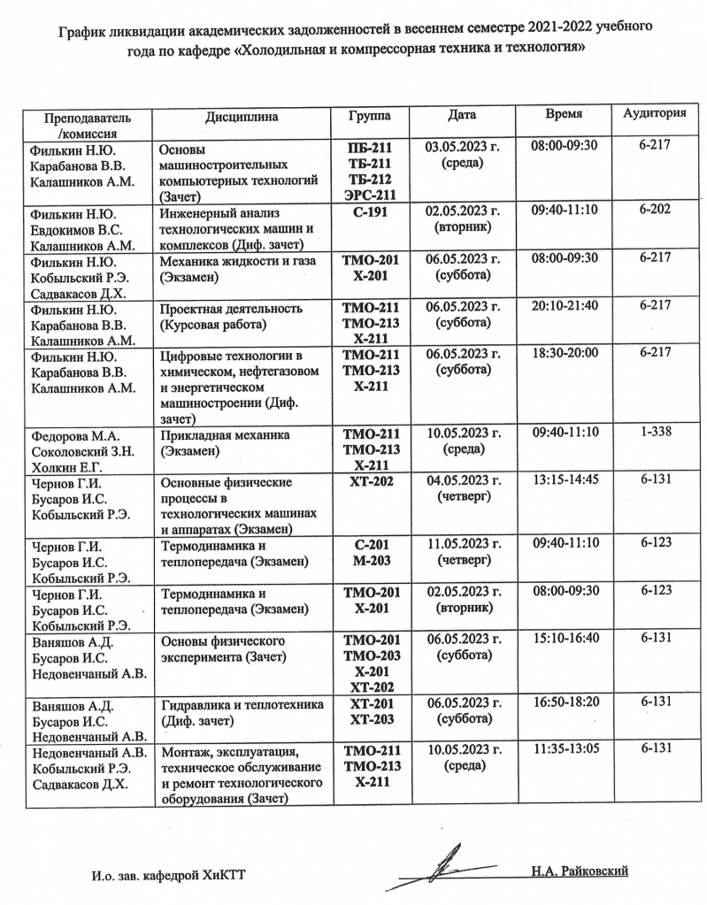 ВНИМАНИЕ!!! Уважаемые студенты ВЫПУСКНЫХ КУРСОВ, просим ознакомиться с Графиком ликвидации задолженностей кафедры "ХОЛОДИЛЬНАЯ И КОМПРЕССОРНАЯ ТЕХНИКА И ТЕХНОЛОГИЯ" по итогам ВЕСЕННЕГО семестра 2022-2023 учебного года.