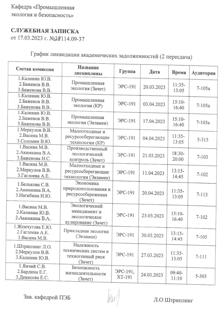 ВНИМАНИЕ!!! Уважаемые студенты ВЫПУСКНЫХ КУРСОВ, просим ознакомиться с Графиком ликвидации задолженностей кафедры "ПРОМЫШЛЕННАЯ ЭКОЛОГИЯ И БЕЗОПАСНОСТЬ" (2я пересдача) по итогам ВЕСЕННЕГО семестра 2022-2023 учебного года.