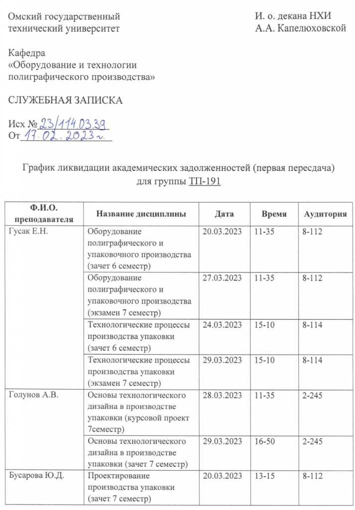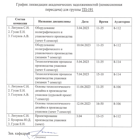 График консультаций и ликвидации академических задолженностей: кафедра "Оборудование и технологии полиграфического производства"