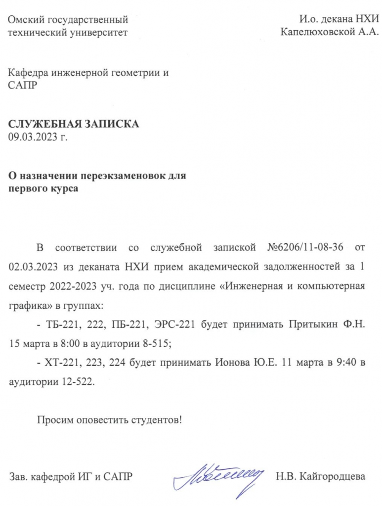 ВНИМАНИЕ!!! Уважаемые студенты, просим ознакомиться с Графиком ликвидации задолженностей кафедры "ИНЖЕНЕРНАЯ ГЕОМЕТРИЯ И САПР" (2я пересдача) по итогам осеннего семестра 2022-2023 учебного года.