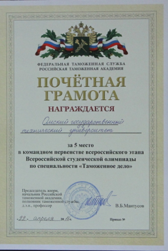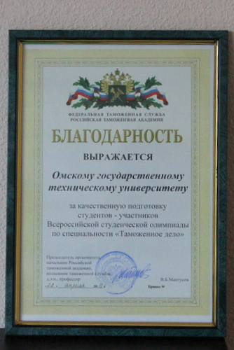 Председатель оргкомитета олимпиады, начальник Российской таможенной академии, полковник таможенной службы, д.э.н., профессор В.Б. Мантусов выразил благодарность Омскому государственному техническому университету, ректору ОмГТУ, д.т.н., профессору Косых А.В., заведующей кафедрой д.э.н., профессору Кузнецовой О.П. за качественную подготовку студентов – участников Всероссийской студенческой олимпиады по специальности «Таможенное дело».