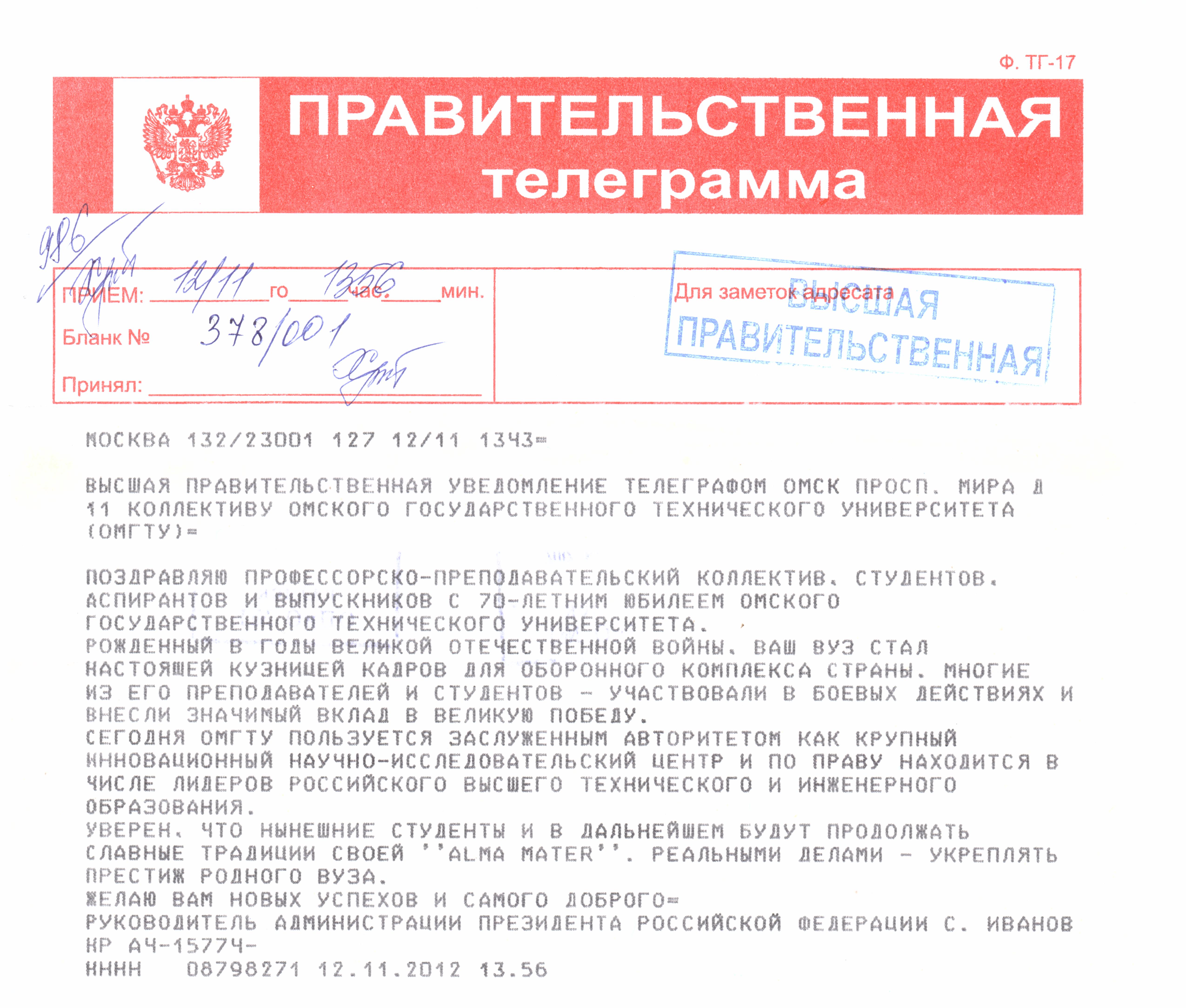 Правительственная телеграмма. Руководитель Администрации Президента Российской Федерации С.Иванов