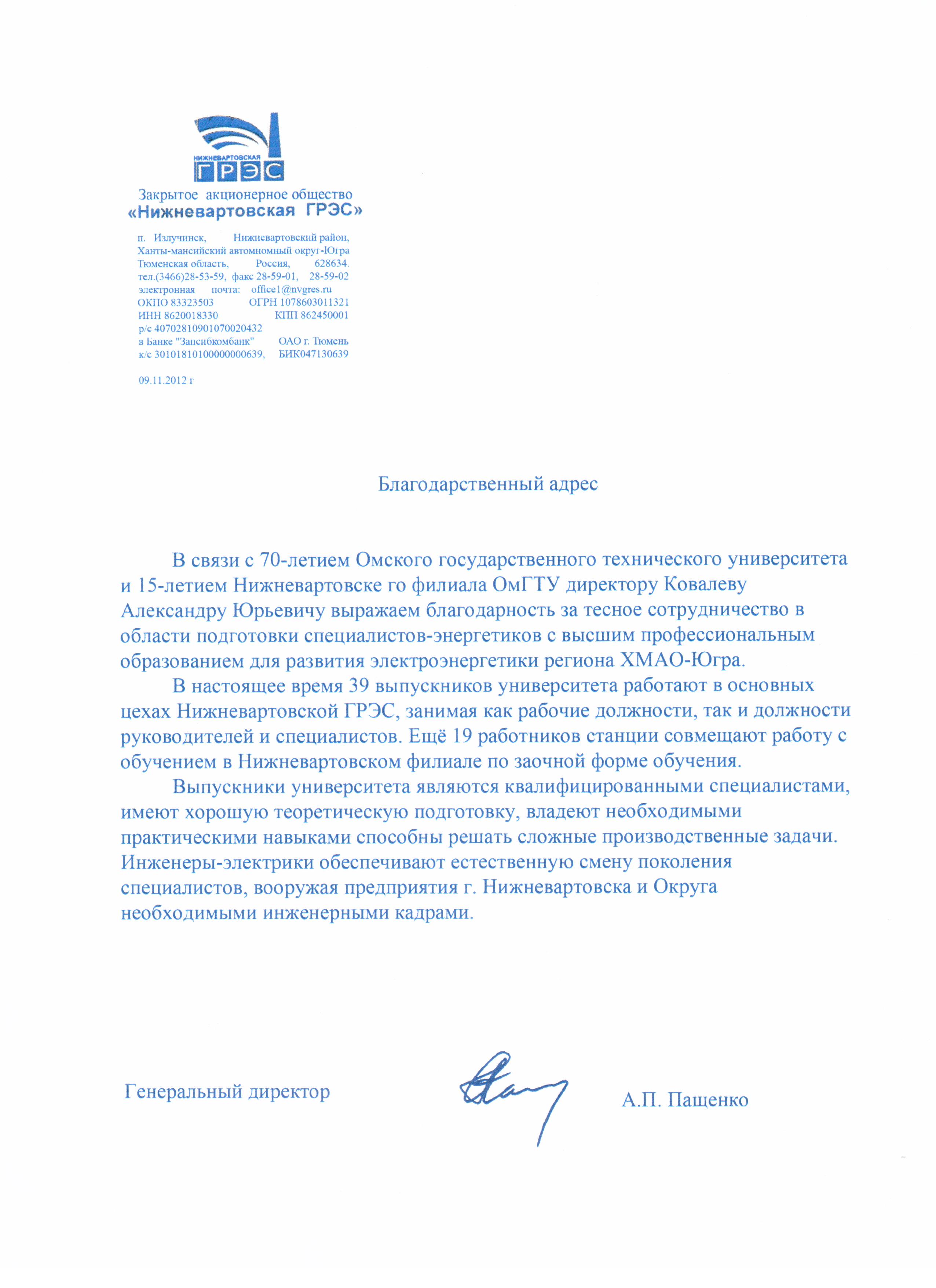 Генеральный директор ЗАО «Нижневартовская ГРЭС» А. П. Пащенко