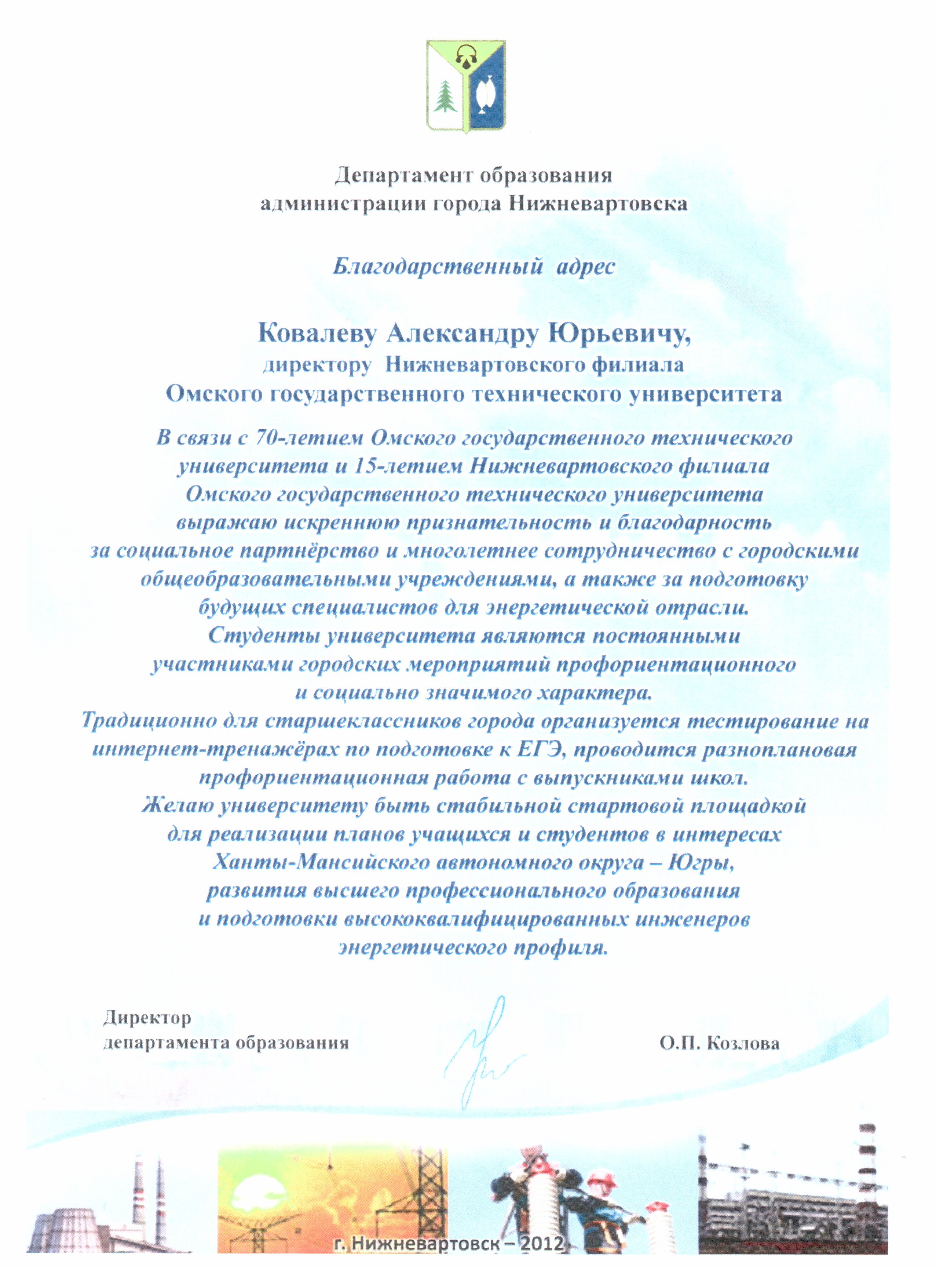 Директордепартамента образования администрации города Нижневартовска О. П. Козлова