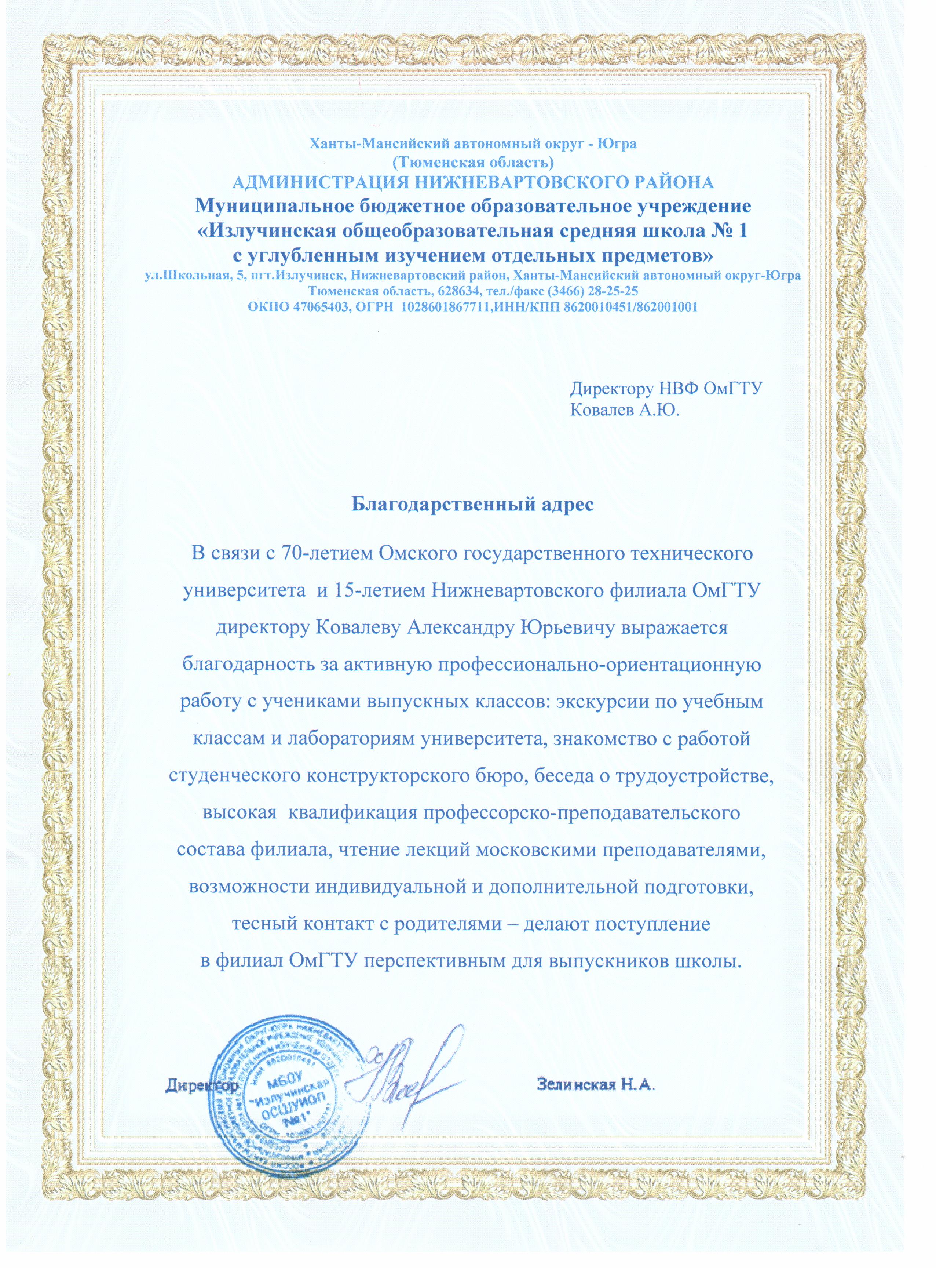 Директор Излученской общеобразовательной средней школы №1 Зелинская Н.А.
