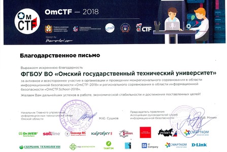 21 и 22 апреля на базе областного Конгресс-холла прошли Межрегиональные соревнования в области информационной безопасности "OmCTF.School-2018" и "OmCTF-2018". Организатором мероприятий выступил Омский государственный технический университет совместно с Главным управлением информационных технологий и связи Омской области и Ассоциацией руководителей служб информационной безопасности ("АРСИБ", г. Москва).