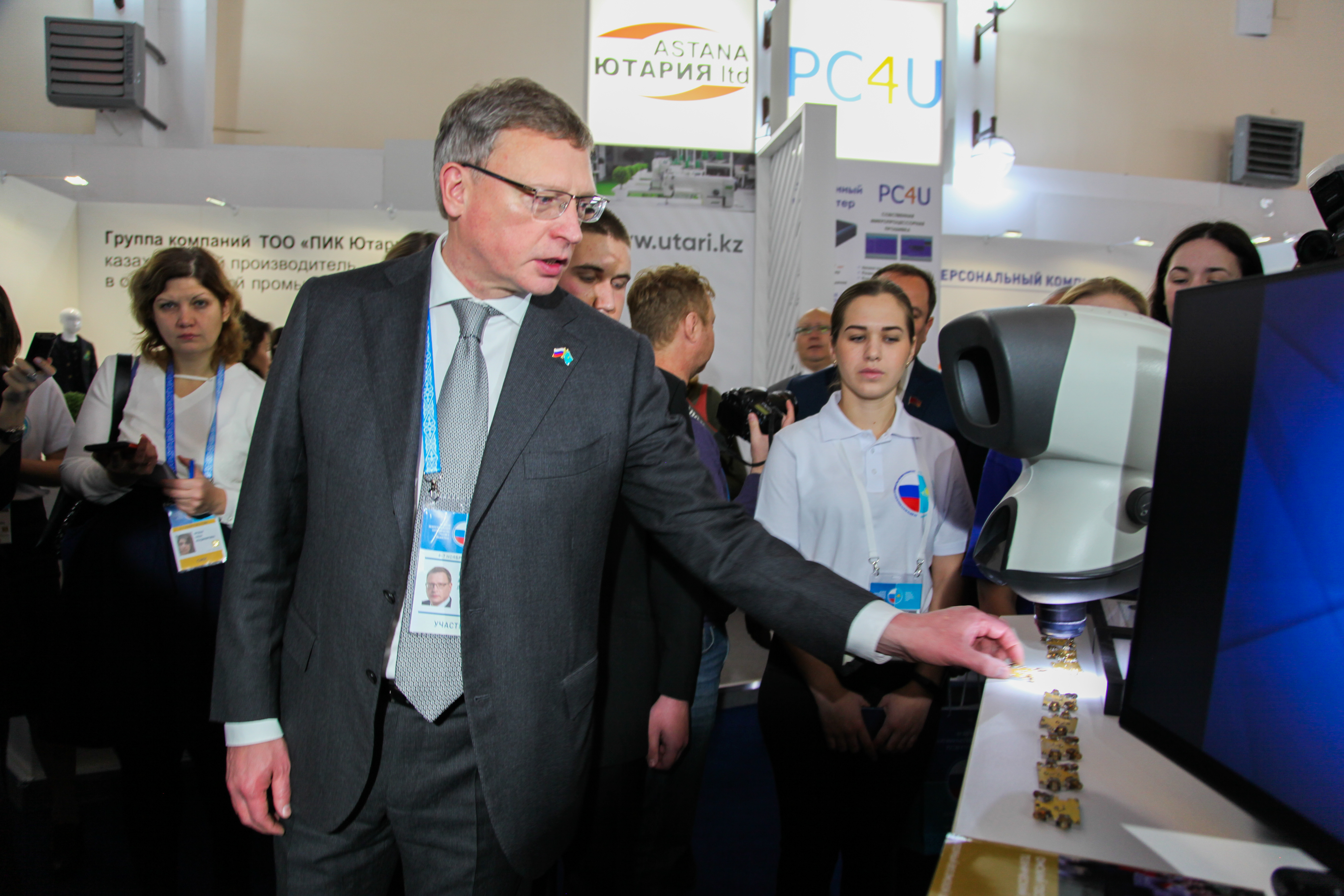 Накануне в Омске завершился XVI Форум межрегионального сотрудничества России и Казахстана. Начался он с экскурсии по выставке «Высокие технологии: возможности регионов России и Казахстана». Открыли ее и первыми ознакомились с передовой продукцией регионов двух государств Губернатор Омской области Александр Бурков и вице-министр торговли и интеграции Республики Казахстан Кайрат Торебаев.