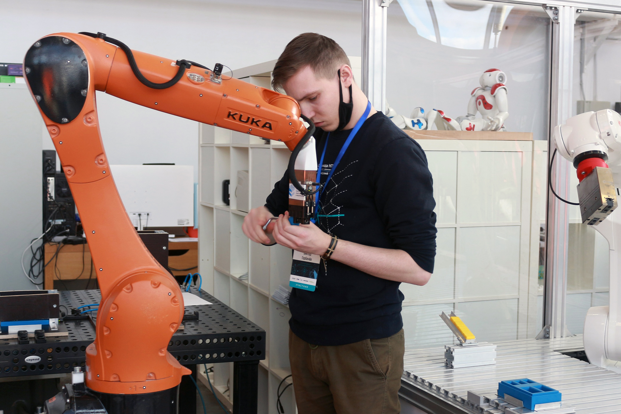 В конце испытания на работу с настоящим оборудованием у конкурсантов было выделено 45 минут, за последние 5 минут им было необходимо продемонстрировать качество работы цифрового двойника на реальном роботизированном оборудовании. Комплекс состоял из двух промышленных роботов KUKA, 4 систем подачи заготовок, конвейера, промышленного контроллера и HMI панели Siemens.